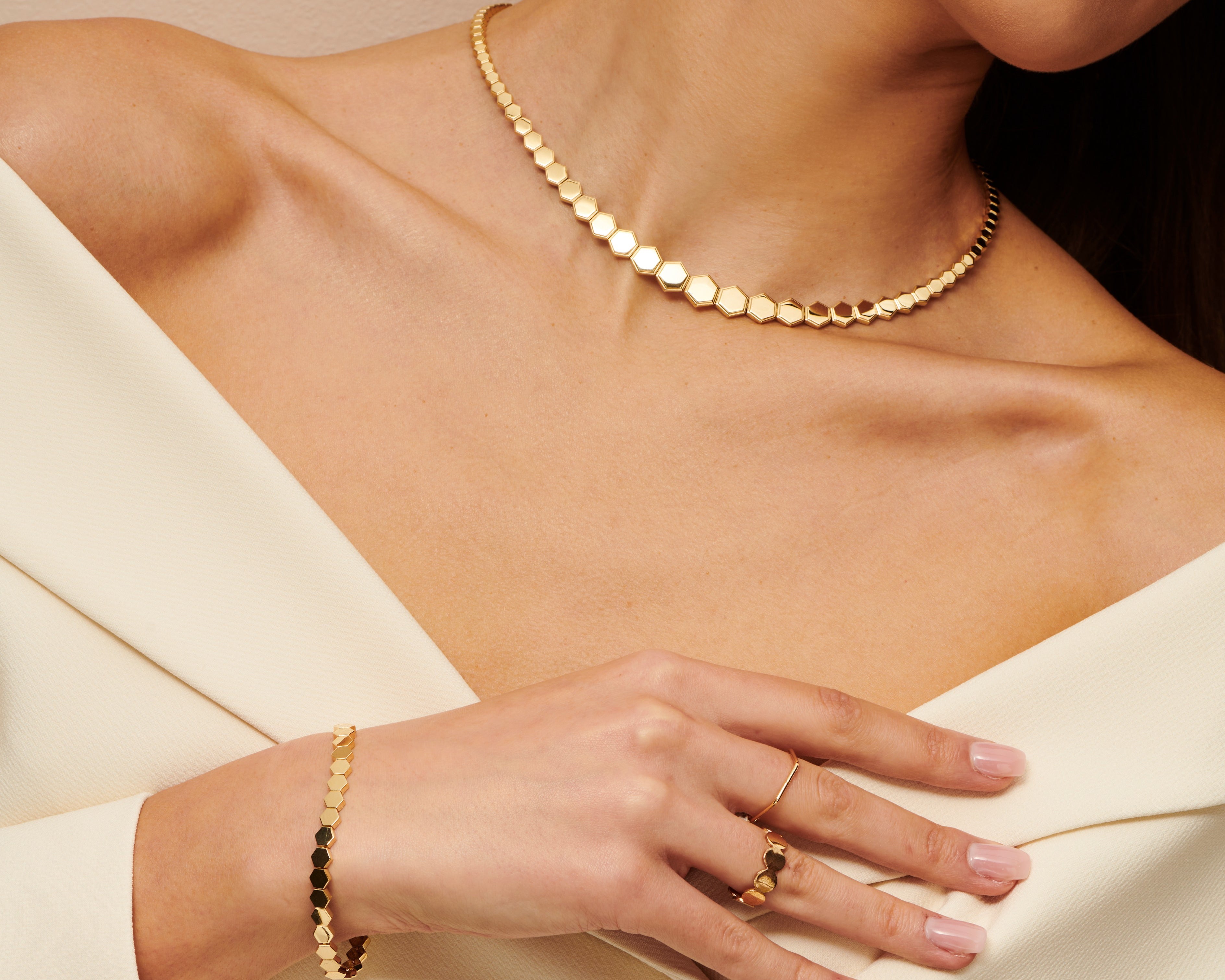 - HiveLoom, a mesmerizing bracelet in 18k solid gold, echoing the honeycomb necklace's intricate pattern.