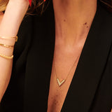 Embark on an Opulent Odyssey with this necklace—a beacon of refined extravagance that transcends the conventional. Picture two layers, meticulously shaped into a V, one adorned with a cascade of scintillating diamonds, the other a sleek silhouette in 18k solid gold. Together, they choreograph a visual masterpiece—a symphony of luxury that resonates with the discerning eye of the modern connoisseur.