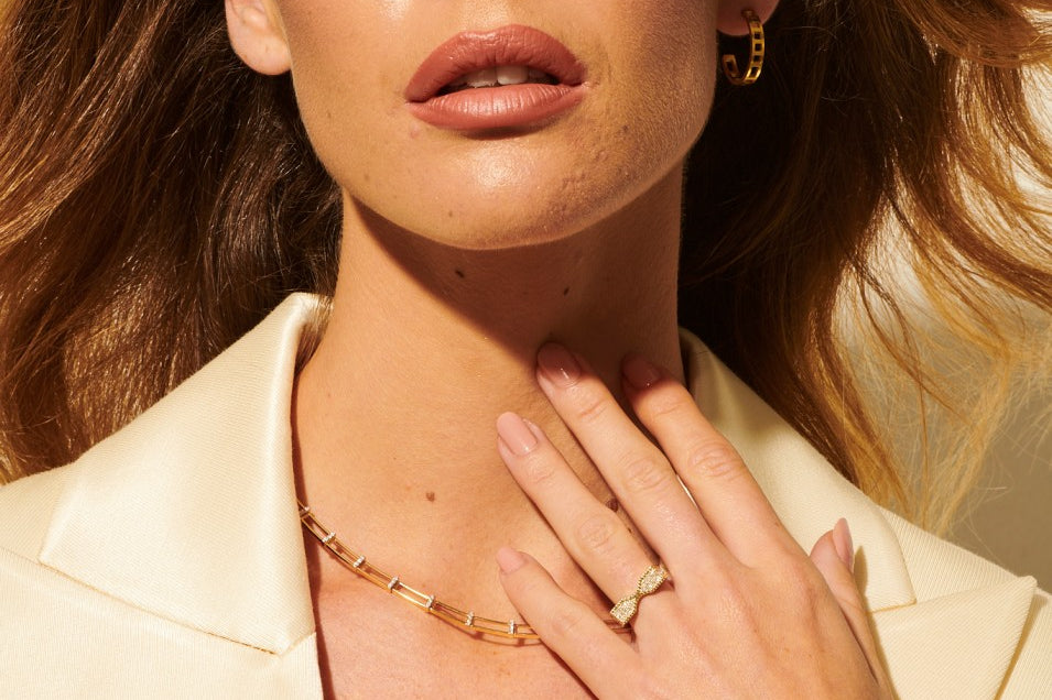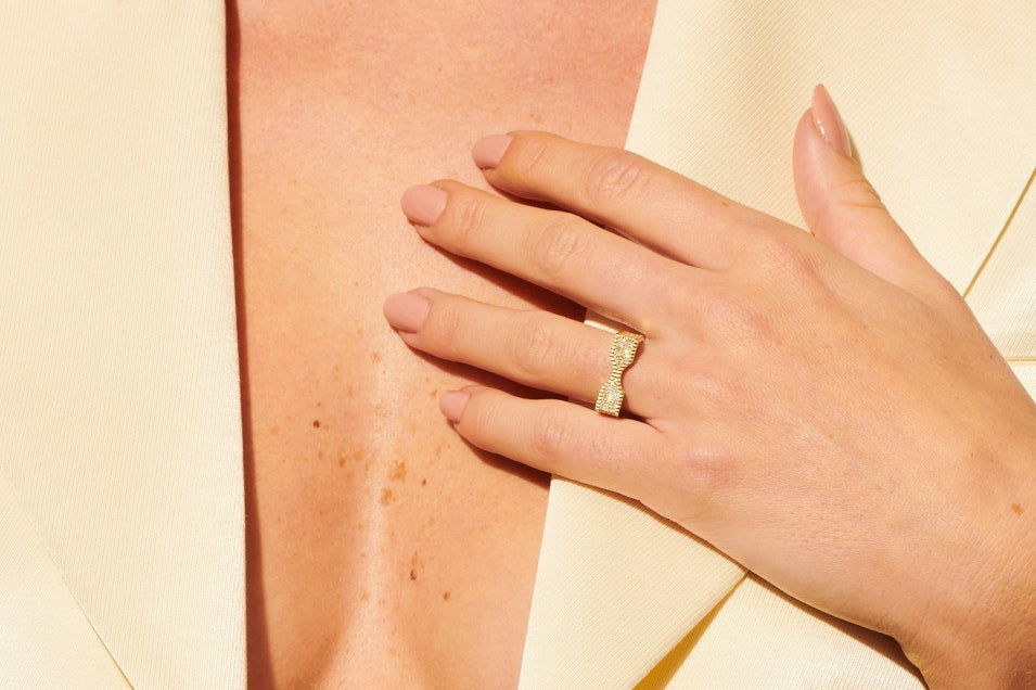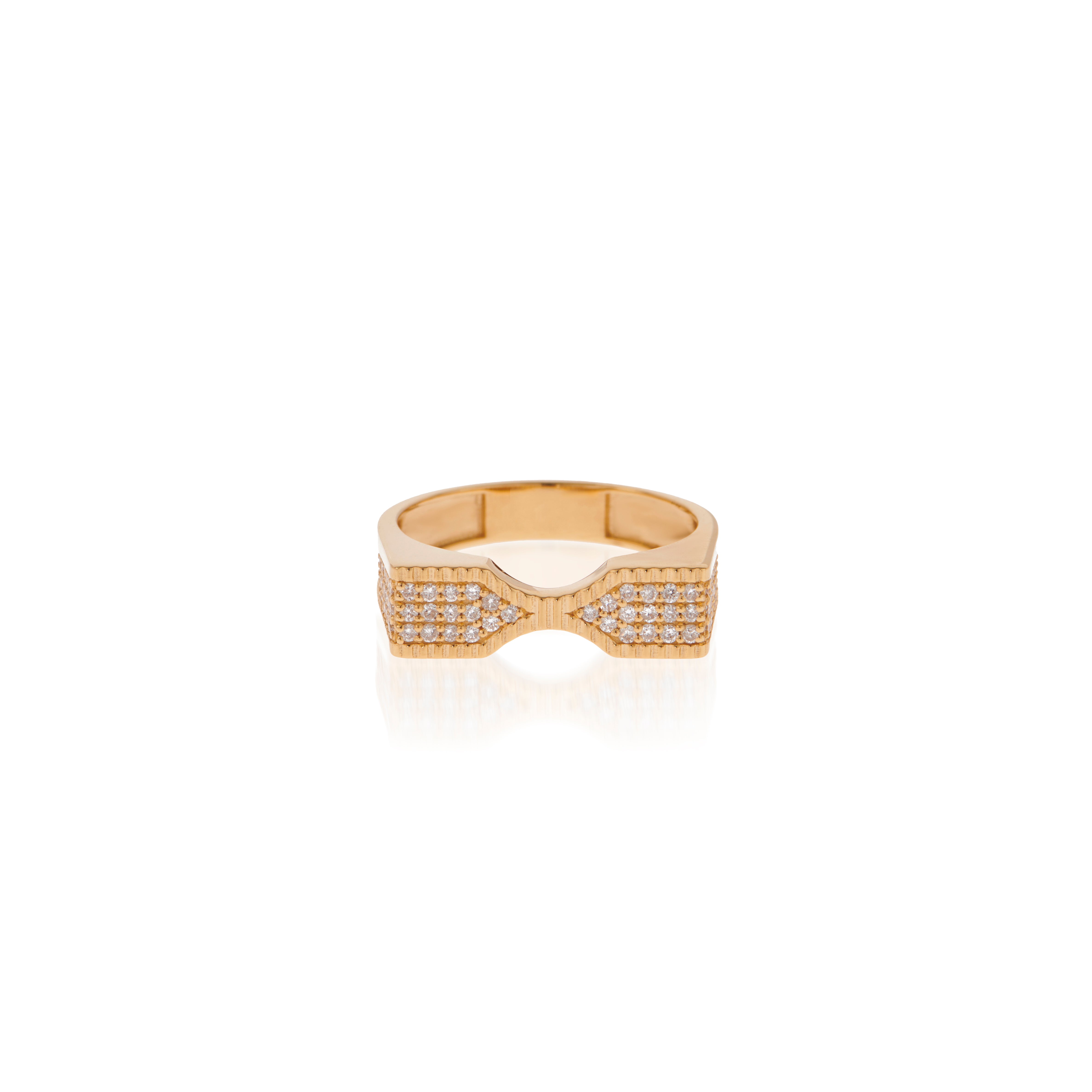 - RadiantRibbon Ring, an extraordinary 18k solid gold ring designed in the playful elegance of sunglasses or a delightful gift ribbon, adorned with a mesmerizing display of round diamonds.