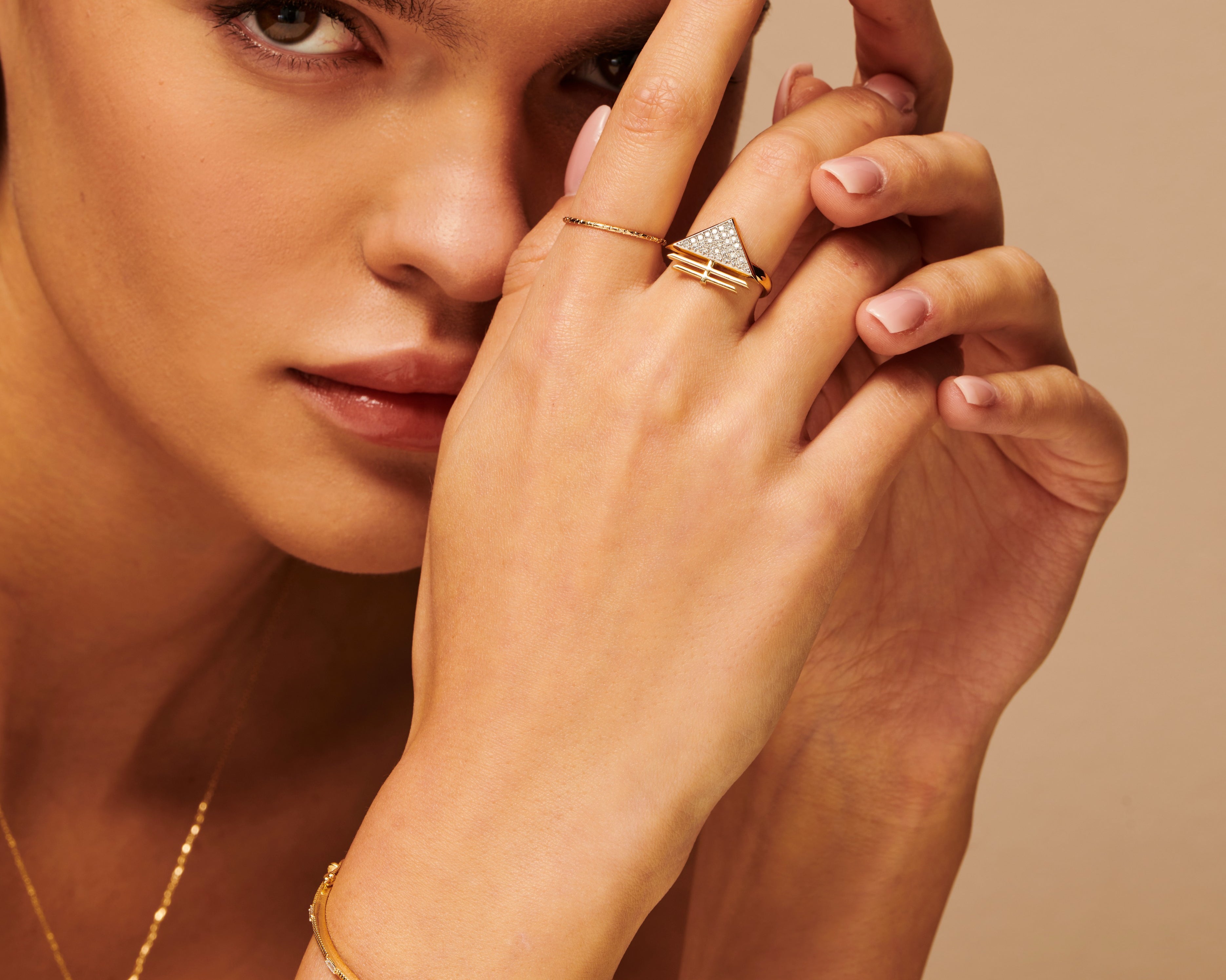 - Regal Radiance Ring, an opulent V shape ring in 18k solid gold adorned with a captivating array of round diamonds, complemented by two sleek gold lines on top.