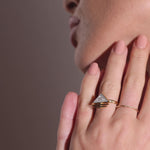 Adorn your hand with the exquisite Regal Radiance Ring—an opulent V shape ring from Vega's collection, meticulously crafted in 18k solid gold. The V shape is adorned with a captivating array of round diamonds, radiating a regal brilliance. Two sleek gold lines crown the V, adding a touch of modern elegance. This ring is not merely an accessory; it's a testament to Vega's commitment to regal beauty and empowered elegance.